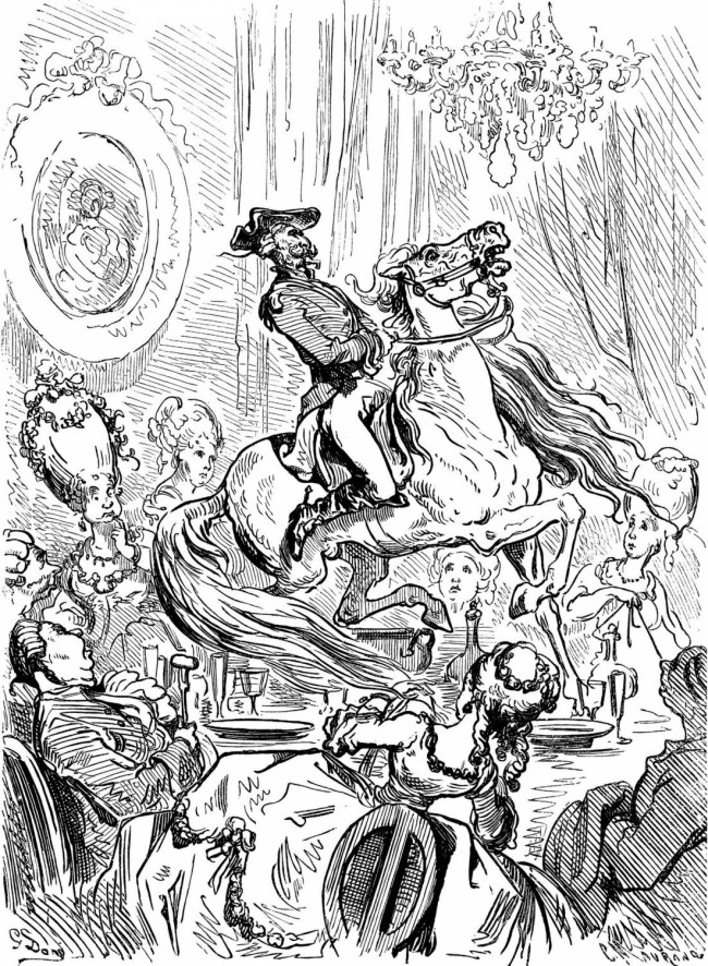 Je descendis en toute hâte l'escalier, et je trouvai le cheval si furieux, que personne n'osait ni le monter, ni même l'approcher; les cavaliers les plus résolus restaient immobiles et fort embarrassés: l'effroi se peignait sur tous les visages, lorsque d'un seul bond je m'élançai sur la croupe du cheval; je le surpris et le matai tout d'abord par cette hardiesse; mes talents hippiques achevèrent de le dompter et de le rendre doux et obéissant. Afin de rassurer les dames, je fis sauter ma bête dans le salon en passant par la fenêtre; je fis plusieurs tours au pas, au trot et au galop, et, pour terminer, je vins me placer sur la table même, où j'exécutai les plus élégantes évolutions de la haute école, ce qui réjouit fort la société. Ma petite bête se laissa si bien mener, qu'elle ne cassa pas un verre, pas une tasse. Cet événement me mit si fort en faveur auprès des dames et du comte, qu'il me pria avec sa courtoisie habituelle de vouloir bien accepter ce jeune cheval, qui me conduirait à la victoire dans la prochaine campagne contre les Turcs, qui allait s'ouvrir sous les ordres du comte Munich.