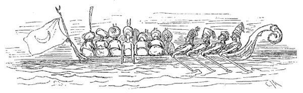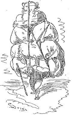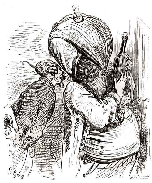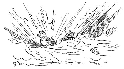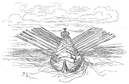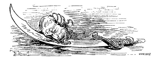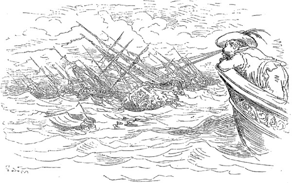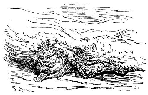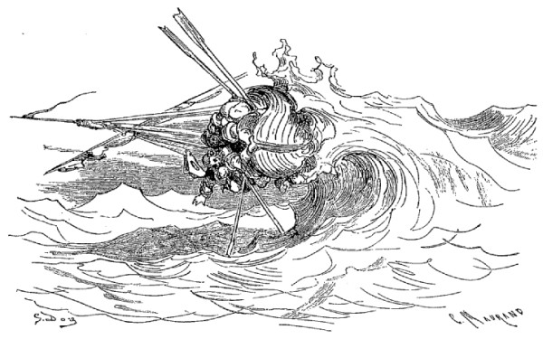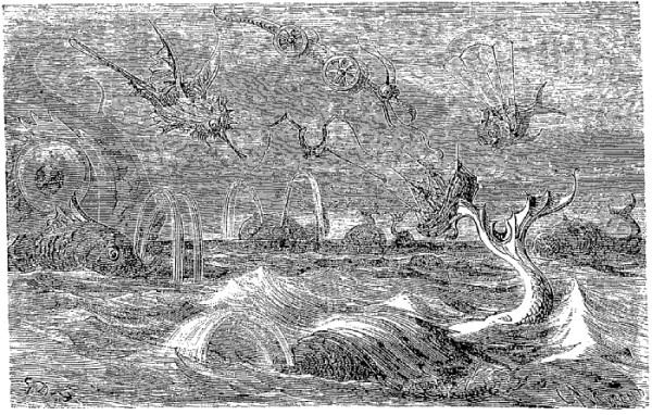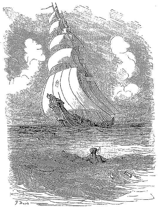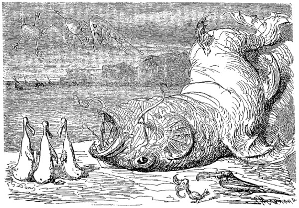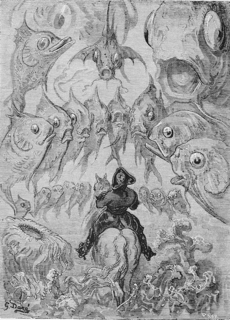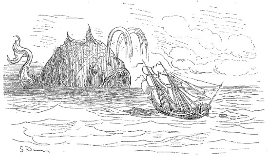 Quand nous eûmes erré trois jours durant, Dieu sait où,—car nous manquions toujours de boussole,—nous arrivâmes dans une mer qui semblait toute noire: nous goûtâmes ce que nous prenions pour de l'eau sale, et nous reconnûmes que c'était de l'excellent vin! Nous eûmes toutes les peines du monde à empêcher nos matelots de se griser. Mais notre joie ne fut pas de longue durée, car, quelques heures après, nous nous trouvâmes entourés de baleines et d'autres poissons non moins gigantesques: il y en avait un d'une longueur si prodigieuse que même avec une lunette d'approche nous n'en pûmes voir le bout. Malheureusement nous n'aperçûmes le monstre qu'au moment où il était tout près de nous: il avala d'un trait notre bâtiment avec ses mâts dressés et toutes ses voiles dehors.