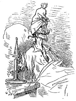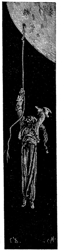 Alors je songeai au retour. Mais, ô désespoir! la chaleur du soleil avait flétri la tige de mon pois, si bien que je ne pouvais descendre par cette voie sans risquer de me casser le cou. Que faire? je tressai avec la paille une corde aussi longue que je pus: je la fixai a l'une des cornes de la lune, et je me laissai glisser. Je me soutenais de la main droite, j'avais ma hache dans la gauche: arrivé au bout de ma corde, je tranchai la portion supérieure et la rattachai à l'extrémité inférieure: je réitérai plusieurs fois cette opération, et je finis, au bout de quelque temps, par discerner au-dessous de moi la campagne du sultan.