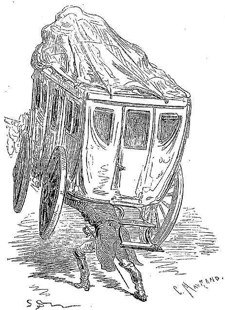 Je descendis aussitôt et commençai par dételer les chevaux; puis je pris sur mes épaules la voiture avec ses quatre roues et ses bagages, et je sautai avec cette charge dans les champs, par-dessus le talus et la haie du bord, haute d'au moins neuf pieds, ce qui n'était pas une bagatelle, vu le poids du fardeau: au moyen d'un second saut, je reportai ma chaise de poste sur la route, au delà de l'autre voiture. Cela fait, je revins vers les chevaux, j'en pris un sous chaque bras, et je les transportai par le même procédé auprès de la chaise; après quoi nous attelâmes et nous atteignîmes sans encombre la station de poste.