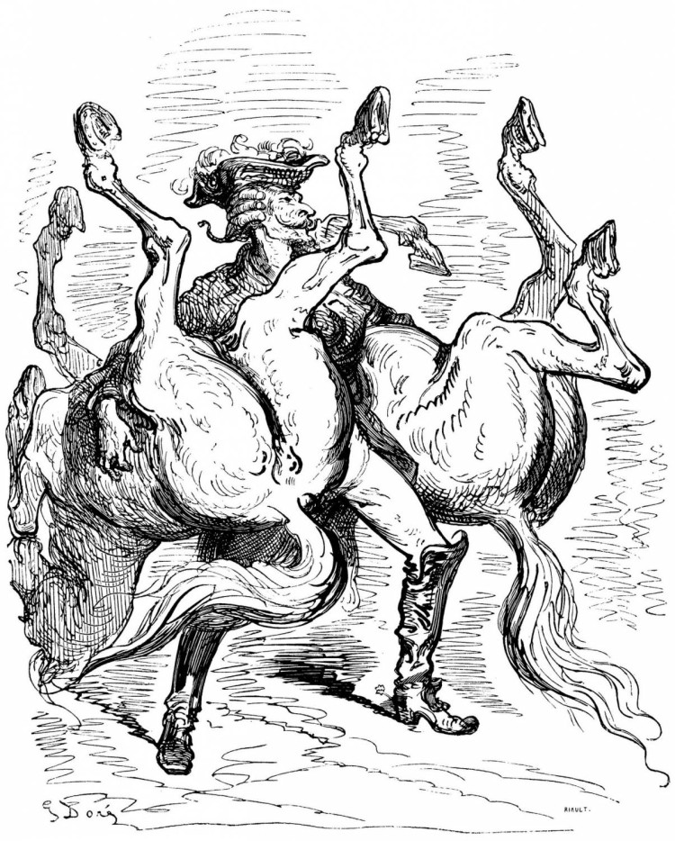 Comment cela était-il arrivé? je ne pouvais m'en rendre compte, lorsqu'enfin mon hussard arriva du côté opposé à celui par lequel j'étais venu et, à travers un torrent de cordiales félicitations et d'énergiques jurons, me rapporta ce qui suit. Tandis que je m'étais jeté pêle-mêle au milieu des fuyards, on avait brusquement laissé retomber la herse de la porte, qui avait tranché net l'arrière-train de mon cheval. Cette seconde partie de ma bête était d'abord restée au milieu des ennemis et y avait exercé de terribles ravages; puis, ne pouvant pénétrer dans la ville, elle s'était dirigée vers un pré voisin, où je la retrouverais sans aucun doute. Je tournai bride aussitôt, et l'avant de mon cheval me mena au grand galop vers la prairie. A ma grande joie, j'y retrouvai en effet l'autre moitié qui se livrait aux évolutions les plus ingénieuses et passait gaiement le temps avec les juments qui erraient sur la pelouse.
