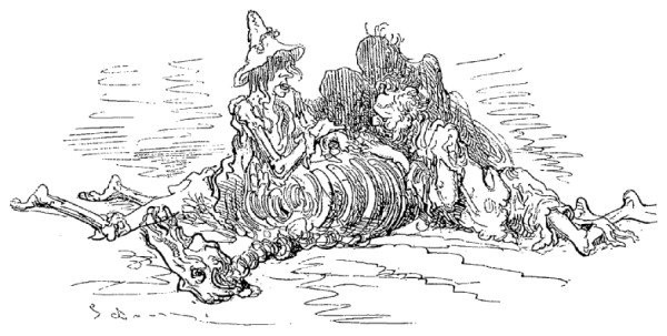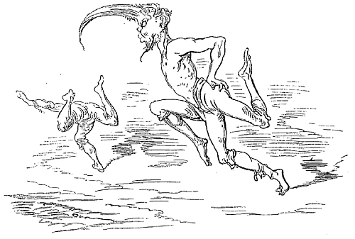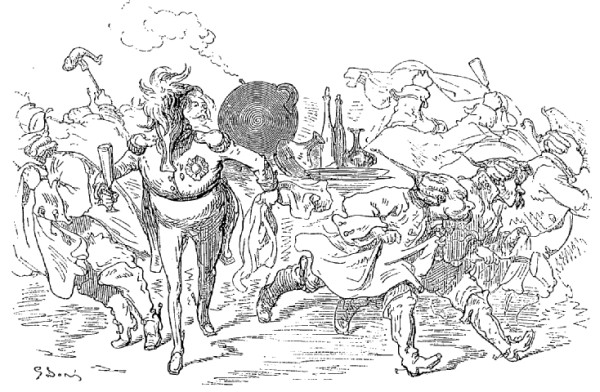 Quand il revint à lui, il demanda qu'on retirât le fromage de dessous ses pieds; on vérifia, et on reconnut qu'il avait parfaitement raison: cette île n'était, comme je viens de vous le dire, qu'un énorme fromage. La plupart des habitants s'en nourrissaient; les parties mangées pendant le jour étaient remplacées pendant la nuit. Nous vîmes dans cette île une grande quantité de vignes chargées de grosses grappes, lesquelles, lorsqu'on les pressait, ne donnaient que du lait. Les insulaires étaient sveltes et beaux, la plupart avaient neuf pieds de haut; ils avaient trois jambes et un bras, et les adultes portaient sur le front une corne dont ils se servaient avec une adresse remarquable. Ils font des courses sur la surface du lait, et s'y promènent sans y enfoncer avec autant d'assurance que nous sur une pelouse.