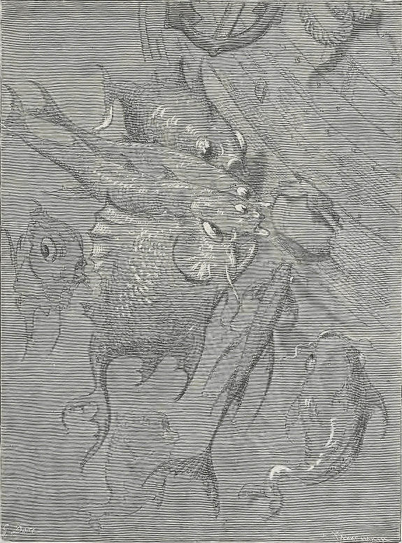 Après que nous eûmes passé quelque temps dans sa gueule, il la rouvrit pour engloutir une énorme masse d'eau: notre navire, soulevé par ce courant, fut entraîné dans l'estomac du monstre, où nous nous trouvions comme si nous eussions été à l'ancre pris d'un calme plat. L'air était, il faut en convenir, chaud et lourd. Nous vîmes dans cet estomac des ancres, des câbles, des chaloupes, des barques et bon nombre de navires, les uns chargés, les autres vides, qui avaient subi le même sort que nous. Nous étions obligés de vivre à la lumière des torches; il n'y avait plus pour nous ni soleil, ni lune, ni planètes. Ordinairement nous nous trouvions deux fois par jour à flot et deux fois à sec. Quand la bête buvait nous étions à flot, lorsqu'elle lâchait l'eau nous étions à sec. D'après les calculs exacts que nous fîmes, la quantité d'eau qu'elle avalait à chaque gorgée eût suffi à remplir le lit du lac de Genève, dont la circonférence est de trente milles.