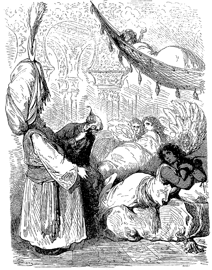 N'ayant entre les mains d'autre arme que la hachette d'argent qui est le signe distinctif des jardiniers et des laboureurs du sultan, je la lançai contre les deux voleurs, dans le but de les effrayer. Je réussis en effet à délivrer la pauvre abeille; mais l'impulsion donnée par mon bras avait été trop forte; la hache s'éleva en l'air si haut, si haut, qu'elle s'en alla tomber dans la lune. Comment la ravoir? Où trouver une échelle pour aller la rechercher?