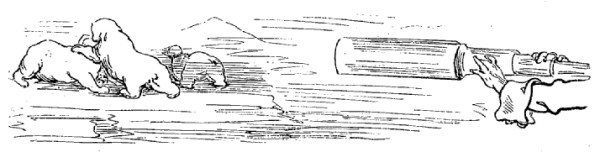 A environ un demi-mille en avant de nous flottait un immense glaçon, aussi haut pour le moins que notre grand mât, et sur lequel je vis deux ours blancs qui, autant que j'en pus juger, étaient engagés dans un duel acharné. Je saisis mon fusil et descendis sur la glace. Mais lorsque j'en eus atteint le sommet, je m'aperçus que le chemin que je suivais était extrêmement dangereux et difficile. Par moments j'étais obligé de sauter par-dessus d'effroyables précipices; dans d'autres endroits la glace était polie et glissante comme un miroir, de sorte que je ne faisais que tomber et me relever. Je parvins cependant à atteindre les ours, mais en même temps je reconnus qu'au lieu de se battre, ils étaient simplement en train de jouer ensemble.
