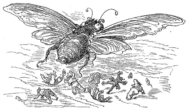 Tout, dans ce monde-là, est extraordinairement grand: une mouche ordinaire, par exemple, est presque aussi grosse qu'un de nos moutons. Les armes usuelles des habitants de la lune sont des raiforts qu'ils manœuvrent comme des javelots, et qui tuent ceux qui en sont atteints. Lorsque la saison des raiforts est passée, ils emploient des tiges d'asperges. Pour boucliers, ils ont de vastes champignons.