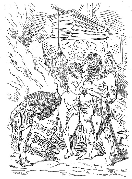 Mais quelle que fût la violence avec laquelle s'élançaient les matières incandescentes, je descendais plus rapidement qu'elles ne montaient, grâce à la loi de la pesanteur, et au bout de quelques instants je touchai le fond. La première chose que je remarquai fut un bruit épouvantable, un concert de jurements, de cris et de hurlements qui semblaient s'élever autour de moi. J'ouvris les yeux, et qu'est-ce que je vis?... Vulcain en personne accompagné de ses cyclopes. Ces messieurs, que mon bon sens avait depuis longtemps relégués dans le domaine de la fiction, étaient depuis trois semaines en querelle au sujet d'un article du règlement intérieur, et c'était cette dispute qui remuait la surface externe. Mon apparition rétablit comme par enchantement la paix et la concorde dans la tapageuse assemblée.