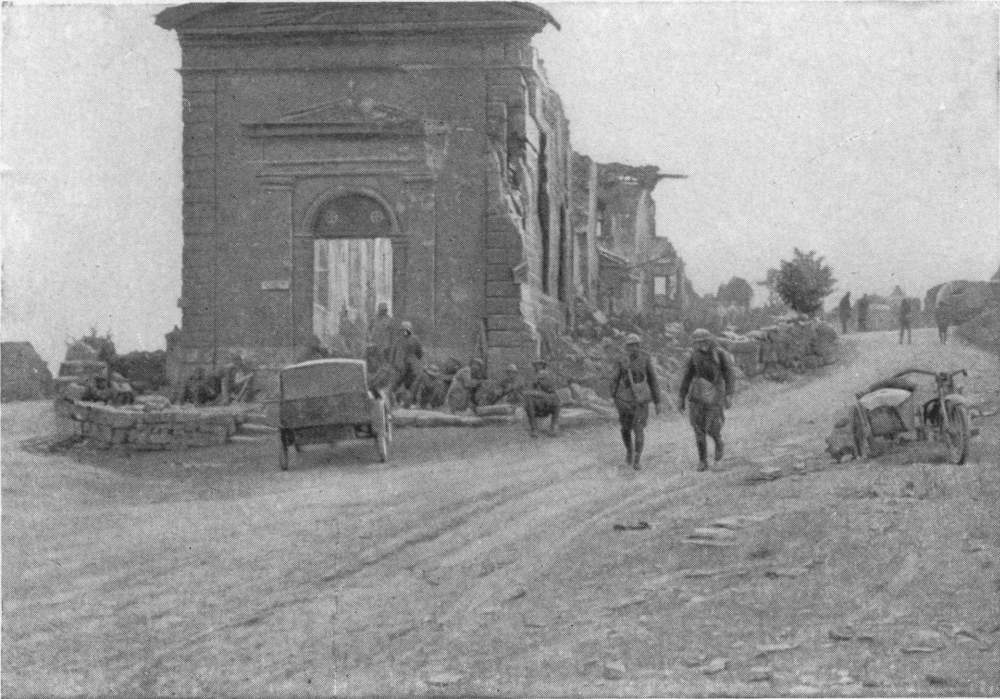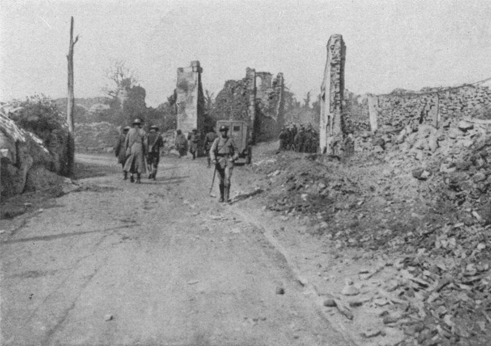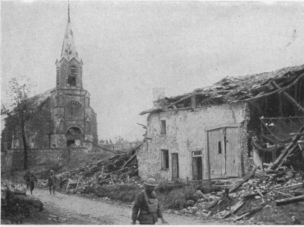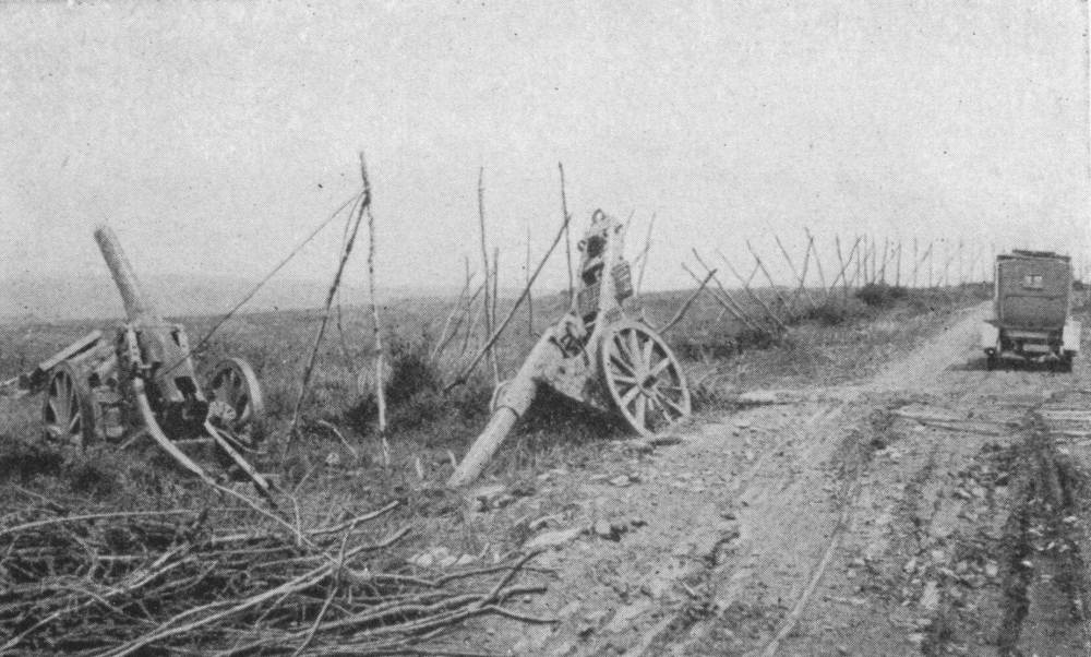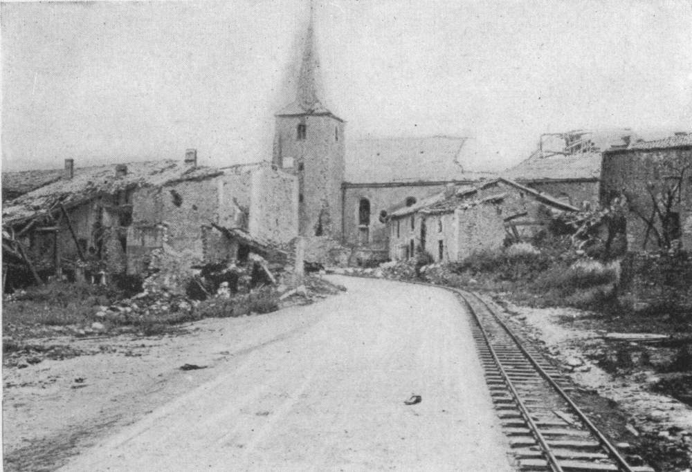 On the 26th, the Crown Prince renewed and developed the attack, which, on the 29th, extended from the Four-de-Paris to about two miles beyond the Binarville-Vienne-le-Château road. After a three days’ bombardment, he hurled at least 40,000 men into action, three times in succession. Against the salient from Bagatelle to the north of Four-de-Paris alone, on a front of about five miles, he launched two divisions. Thanks to a hail of shells and gas bombs, the enemy advanced and, through the corridor of the Biesme, came within five miles of their objective, the railway station of Les Islettes. The fire of the 75’s, however, barred the road, and the French reserves subsequently counter-attacked and retook the lost ground covered with enemy dead.