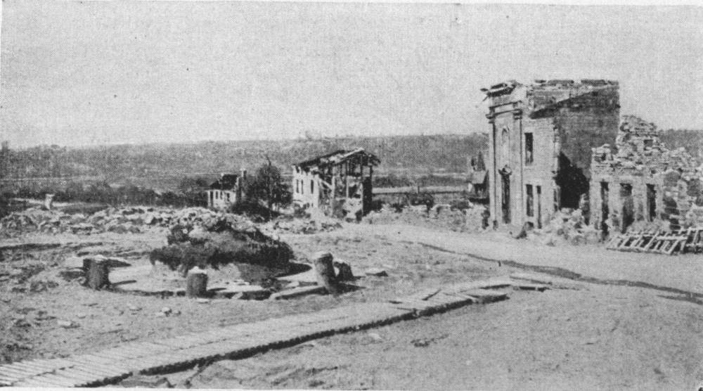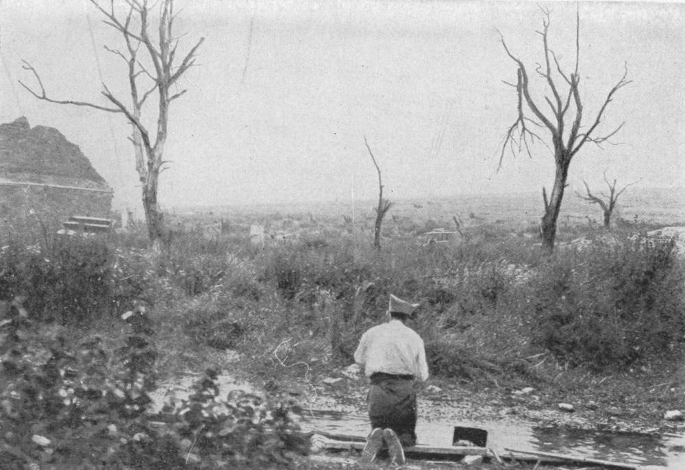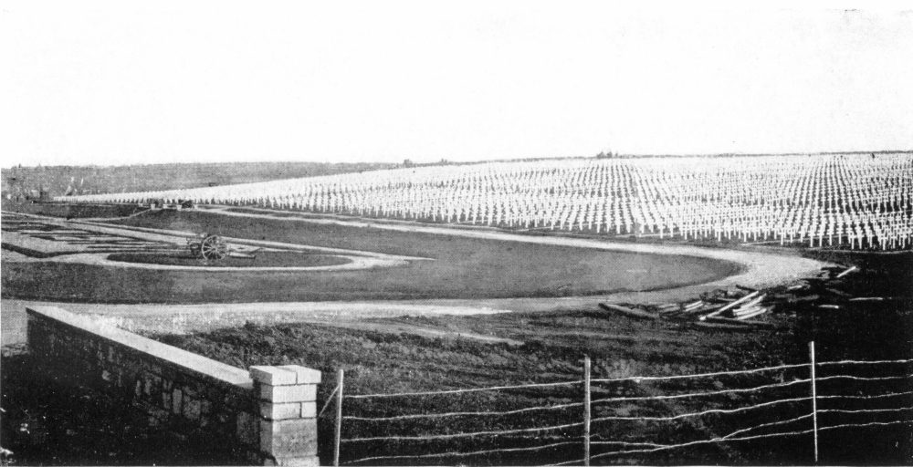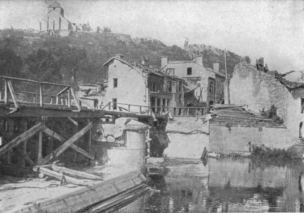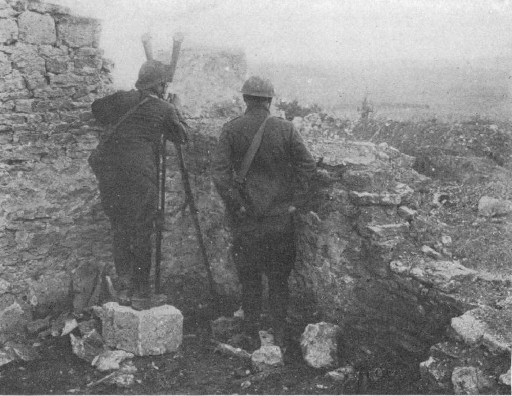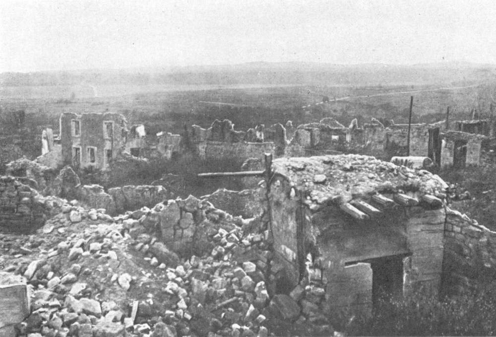 On the 26th, the Crown Prince renewed and developed the attack, which, on the 29th, extended from the Four-de-Paris to about two miles beyond the Binarville-Vienne-le-Château road. After a three days’ bombardment, he hurled at least 40,000 men into action, three times in succession. Against the salient from Bagatelle to the north of Four-de-Paris alone, on a front of about five miles, he launched two divisions. Thanks to a hail of shells and gas bombs, the enemy advanced and, through the corridor of the Biesme, came within five miles of their objective, the railway station of Les Islettes. The fire of the 75’s, however, barred the road, and the French reserves subsequently counter-attacked and retook the lost ground covered with enemy dead.