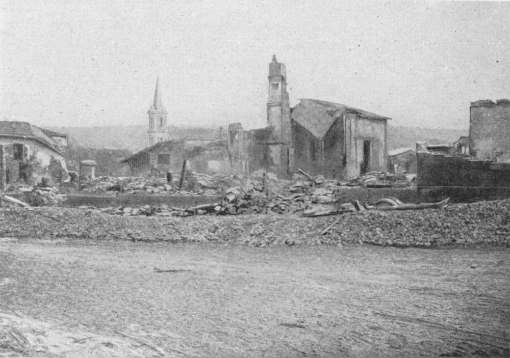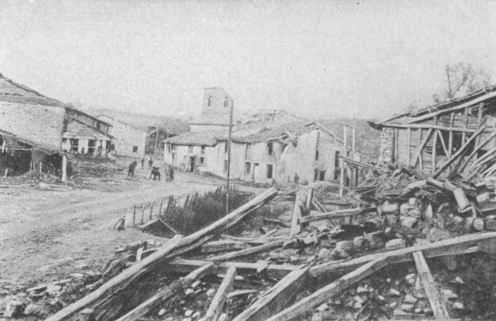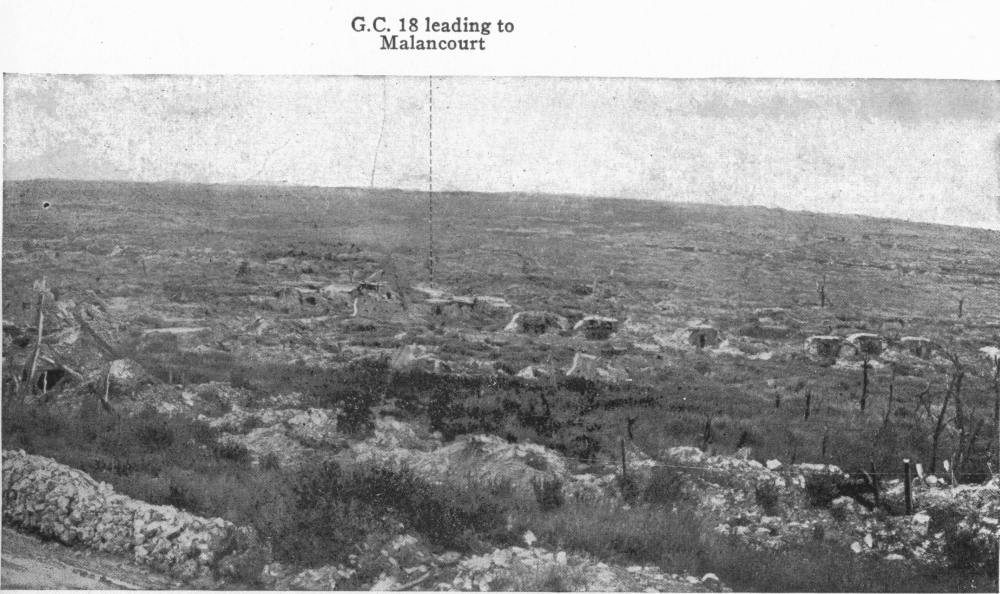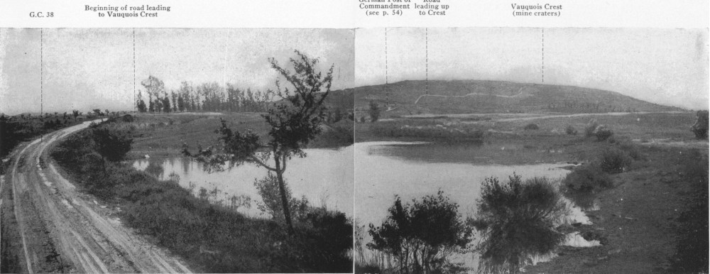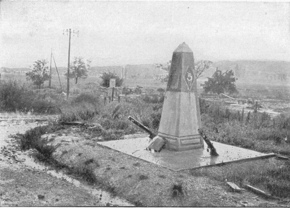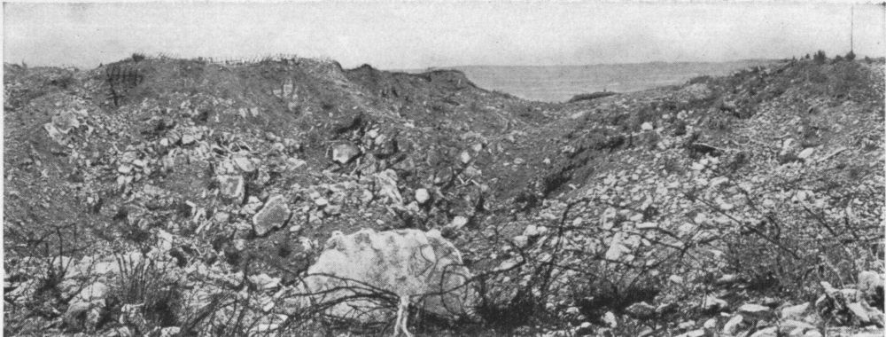 For almost a year the struggle on this line continued with unabated desperateness. It is impossible to enumerate here all the battles fought almost daily in the sectors of Fontaine-aux-Charmes, Bagatelle, Marie-Thérèse, Fontaine-Madame, St. Hubert, Four-de-Paris, Les Meurissons, Bolante Wood, Courte-Chausse and Haute-Chevauchée. The most important are referred to later, in the Itinerary. On the whole, the French troops, with whom the Garibaldian Regiment co-operated for a short time, made some progress and inflicted bitter defeats on the enemy. To the east, in the Valley of the Aire, though they failed against Boureuilles, they succeeded in March, after numerous attacks, in taking Vauquois.