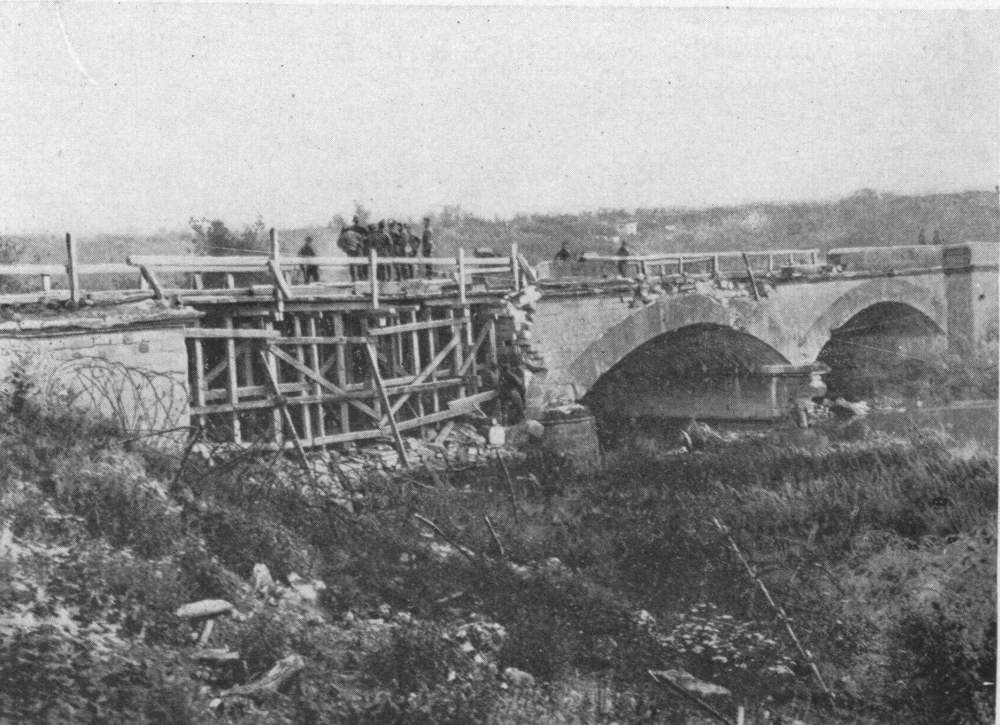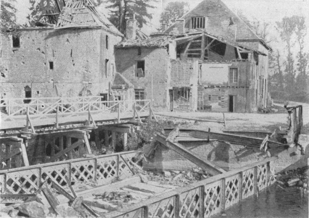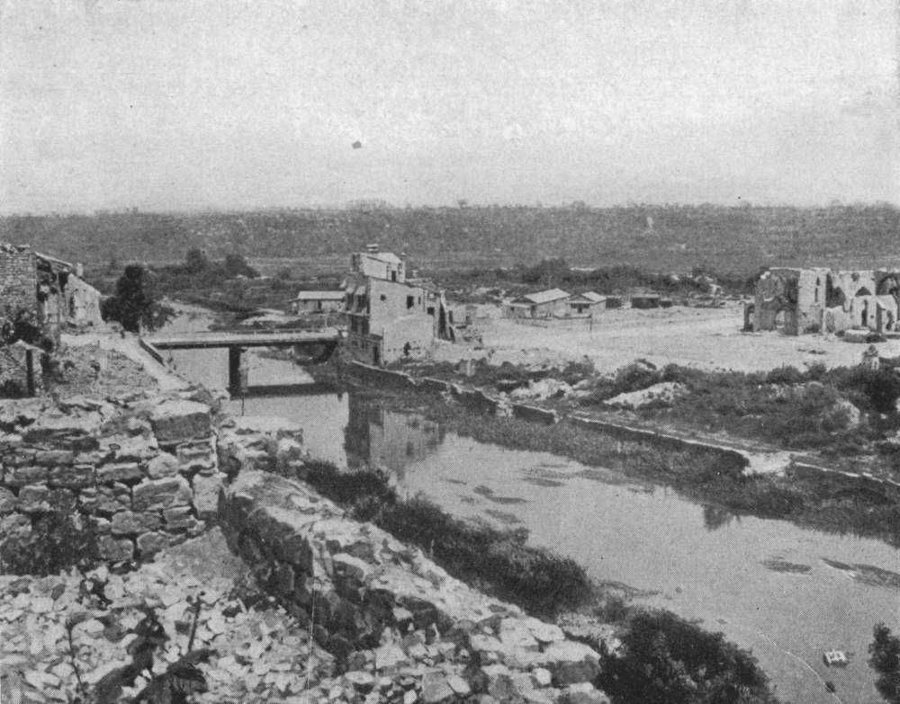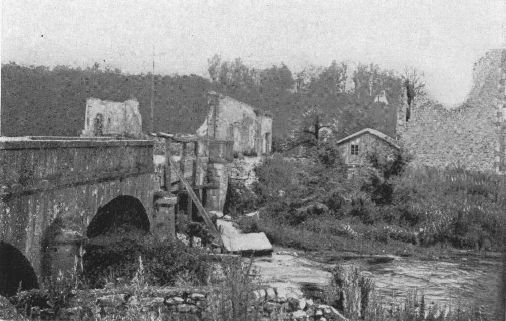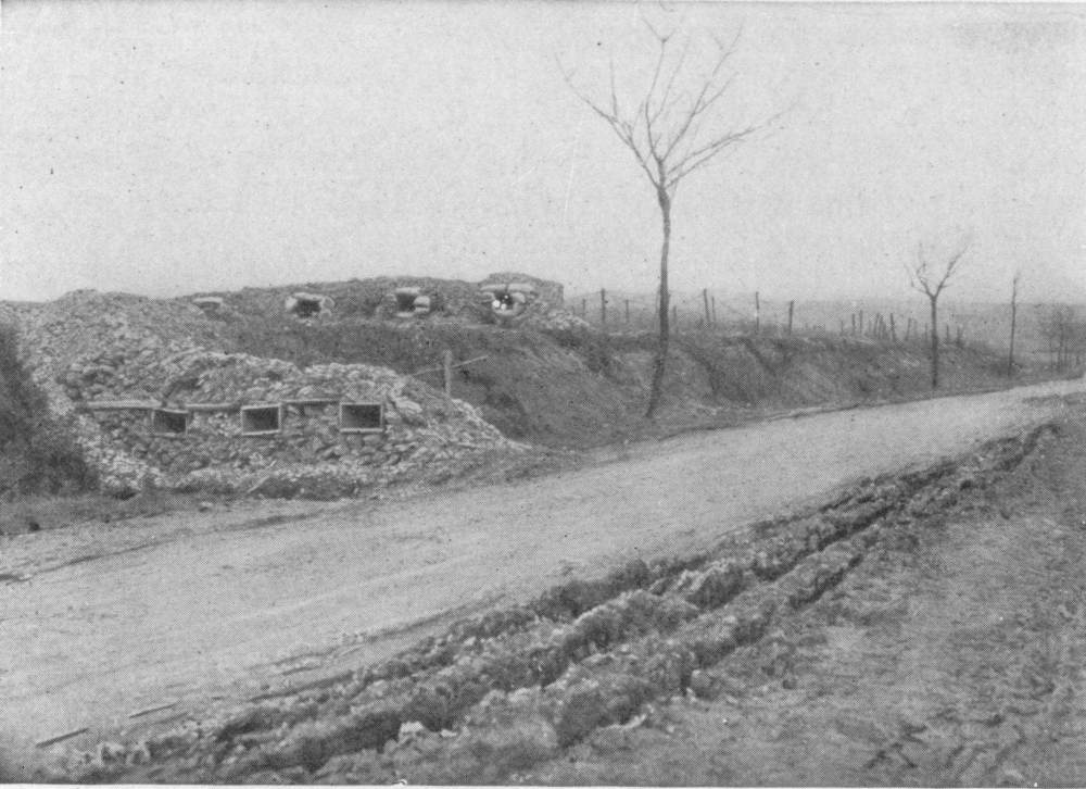 In January, 1915, the line crossed the Melzicourt Ford, a little upstream from Servon, and the Servon-Vienne-le-Château road to the north of Fontaine-la-Houyette, running thence, with numerous salients and re-entrants, through Gruerie Wood, as far as Fontaines-aux-Charmes and the outskirts of Bagatelle. From there it went south through Fontaine-Madame to within three-quarters of a mile north of La Harazée, then north towards St. Hubert, then south again, crossing the Meurissons Stream, to within 300 yards of Four-de-Paris, finally turning eastwards across the Woods of Bolante and Courte-Chausse, to the Valley of the Aire between Neuvilly and Boureuilles.