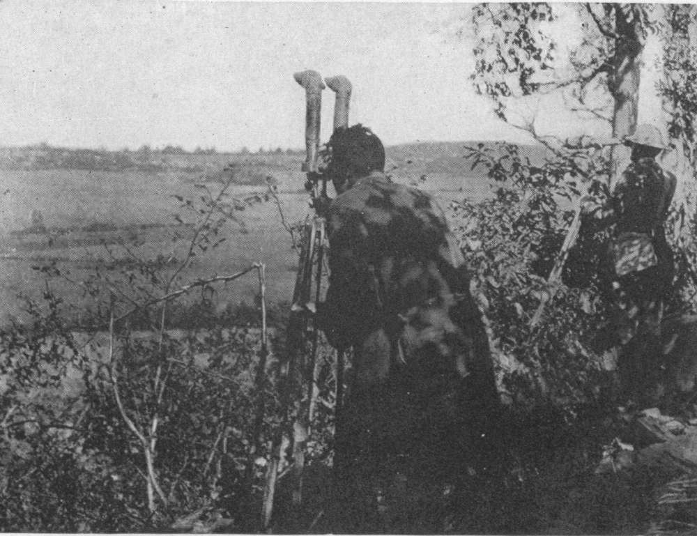 These trenches, dug haphazard under enemy fire, were very irregular in line, and French and German trenches sometimes overlapped. The fusillade was uninterrupted, but erratic, except for a few snipers perched here and there in the trees. At night, the forest was swept at random by rifle and machine-gun fire, to make movement dangerous and to prevent surprise. Rockets continually lit up the night. Here the rifle was merely an auxiliary weapon, but grenade and bomb fighting went on all day without respite.{10}