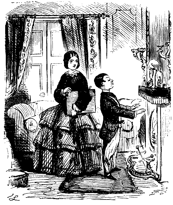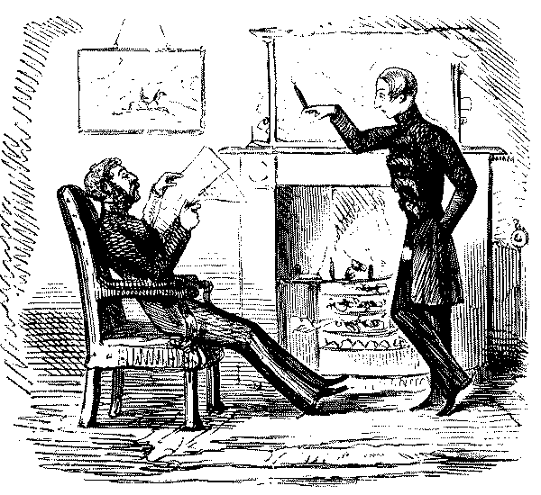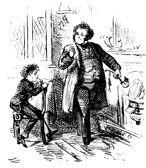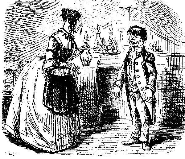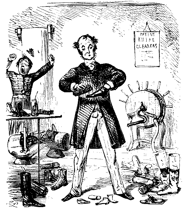 Mistress. "NOW, I DO HOPE, SAMUEL, YOU WILL MAKE YOURSELF TIDY, GET YOUR CLOTHES LAID IN TIME—AND TAKE GREAT PAINS WITH YOUR WAITING AT TABLE!"