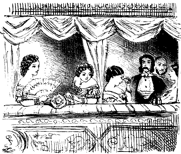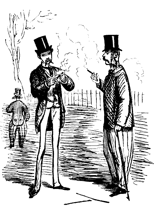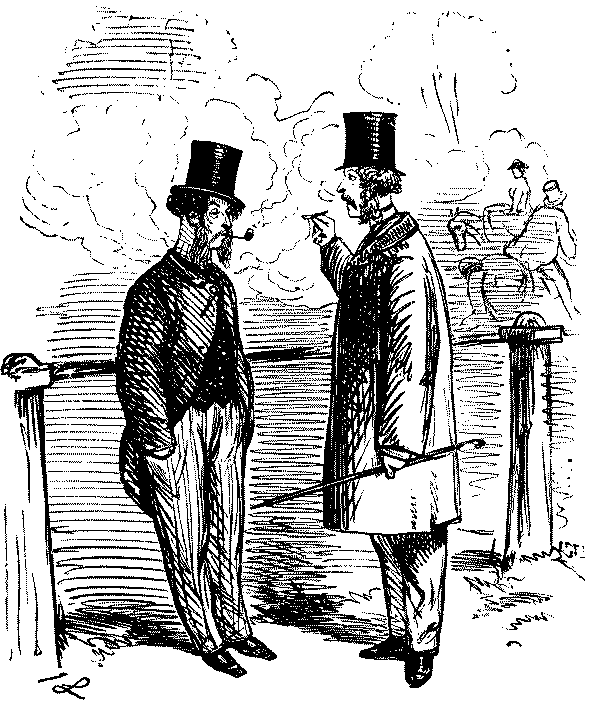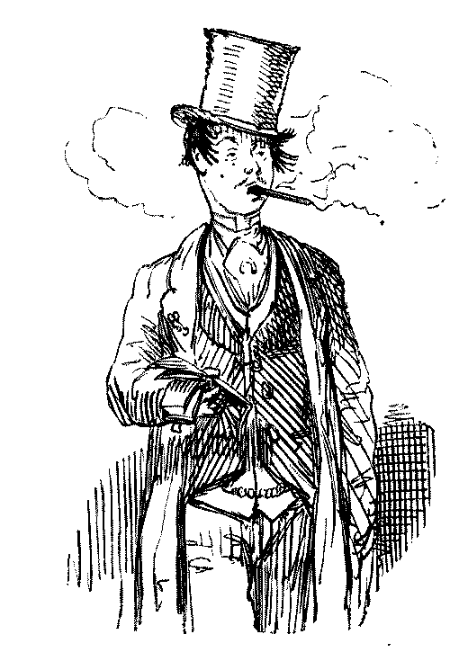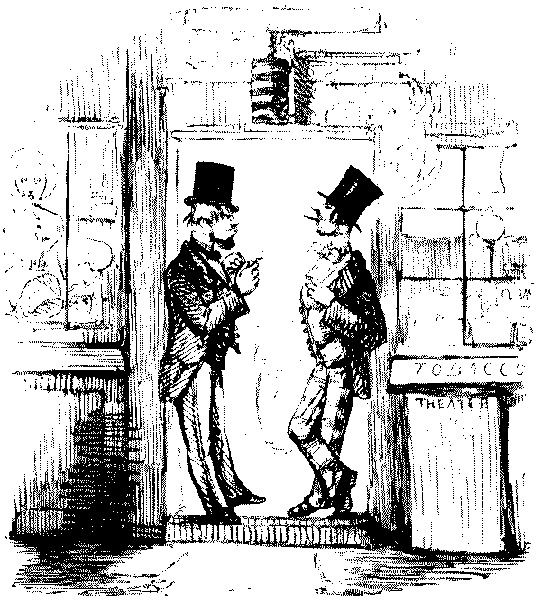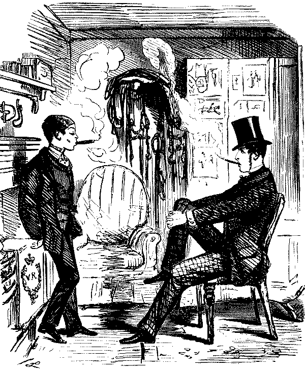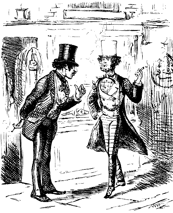 "AW—I WENT THE OTHER NIGHT. BUT, AW—I DON'T KNOW—SOMEHOW, PANTOMIMES ARE NOT WHAT THEY USED TO BE IN MY TIME; AND AS FOR THE GURLS, THERE WASN'T A GOOD-LOOKING ONE IN THE HOUSE."