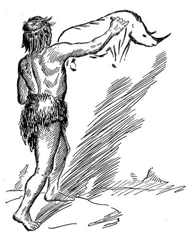 Modor loved adventure, and he made up his mind to gather a fleet of ships, and cross the water to the land of the sea people, and attack them. But he did not live to do this. One day, while hunting in the marsh of the reeds, up the coast, a great beast like a rhinoceros, with long woolly hair, and sharp horns on its snout, charged down on him and his companions. They fought bravely, but Modor and two of his men were killed, and the rest fled to their boat, afraid.