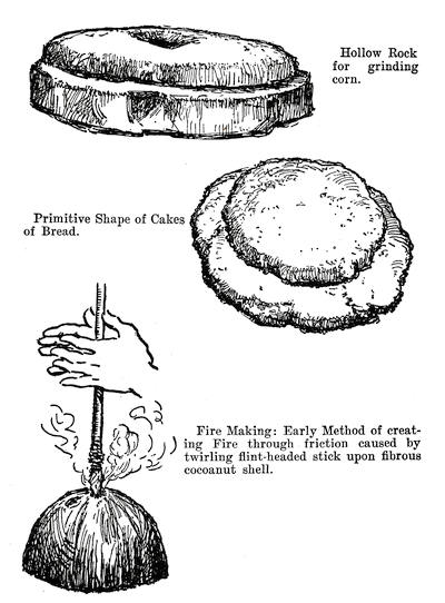The island people found plenty of flint, out of which to make weapons and tools for working wood, and they were very skilful fishermen, and also great hunters with the bow and arrow. As they made hunting trips far back into the country, they found many different kinds of wood for making bows and small canoes, but no reeds were to be found, so they forgot the art of making basket work. Neither did they find any clay, for a long time, and when the few bowls and jars they had brought with them were broken, they made drinking cups of the horns of animals, or of wood. They still used smoked meat and fish, but they knew nothing about planting and growing grains to make bread.