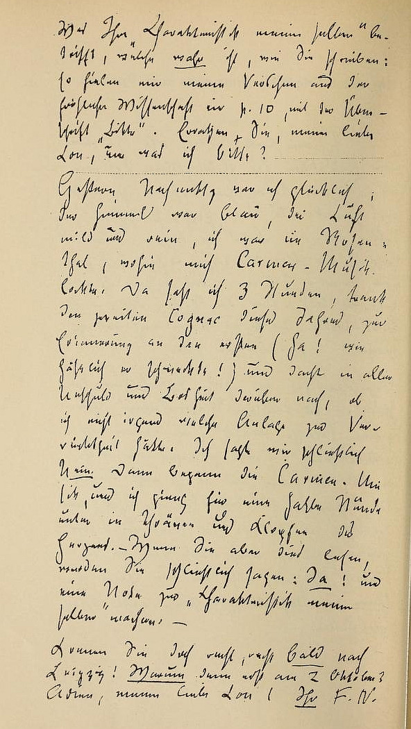Gestern nachmittag war ich glücklich; der Himmel war blau, die Luft mild und rein, ich war in Rosenthal, wohin mich Carmen-Musik lockte. Da saß ich drei Stunden, trank den zweiten Cognac dieses Jahres, zur Erinnerung an den ersten (ha! wie häßlich er schmeckte!) und dachte in aller Unschuld und Bosheit darüber nach, ob ich nicht irgendwelche Anlage zur Verrücktheit hätte. Ich sagte schließlich nein. Dann begann die Carmen-Musik, und ich ging für eine halbe Stunde unter in Tränen und Klopfen des Herzens.—Wenn Sie aber dies lesen, werden Sie schließlich sagen: ja! und eine Note zur »Charakteristik meiner selber« machen.—