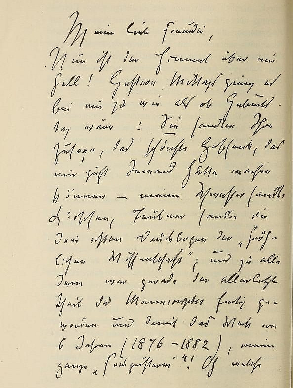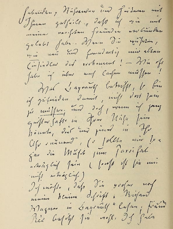 Ich habe viel an Sie gedacht und im Geiste so mancherlei des Erhebenden, Rührenden und Heiteren mit Ihnen getheilt, daß ich wie mit meiner verehrten Freundin verbunden gelebt habe. Wenn Sie wüßten, wie neu und fremdartig mir alten Einsiedler das vorkommt!—Wie oft habe ich über mich lachen müssen! Was Bayreuth betrifft, so bin ich zufrieden damit, nicht dort sein zu müssen; und doch, wenn ich ganz geisterhaft in Ihrer Nähe sein könnte, dies und jenes in Ihr Ohr raunend, so sollte mir sogar die Musik zum Parsifal erträglich sein (sonst ist sie mir nicht erträglich.)