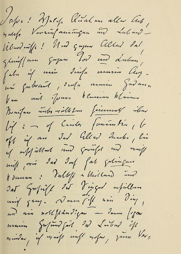 Und immer wieder tritt Zweierlei an diesem Vorgang besonders auffällig hervor: Einmal der enge Zusammenhang von Gedankenleben und Seelenleben in seinem Wesen, die Abhängigkeit seines Geistes von den Bedürfnissen und Erregungen seines Innern. Dann aber die Eigenthümlichkeit, dass aus dieser so engen Zusammengehörigkeit sich immer von Neuem Leiden ergeben müssen; jedesmal bedarf es einer höhen Gluth der Seele, wo es zu höchster Klarheit, zu hellem Licht der Erkenntniss kommen soll,—aber nie darf diese Gluth in wohlthuender Wärme ausströmen, sondern muss verwunden mit sengenden Feuern und brennenden Flammen: auch hier gehört,—wie er es in dem oben angeführten Briefe ausdrückt,—»das Leiden zur Sache«.
