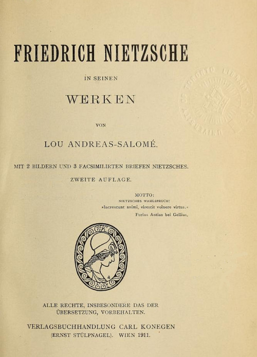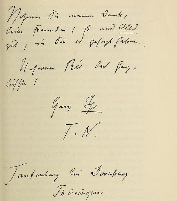 Und wie glücklich bin ich, meine geliebte Freundin Lou, jetzt in Bezug auf uns Beide denken zu dürfen »Alles im Anfang und doch Alles klar!« Vertrauen Sie mir! Vertrauen wir uns! Mit den herzlichsten Wünschen für Ihre Reise Ihr Freund Nietzsche.