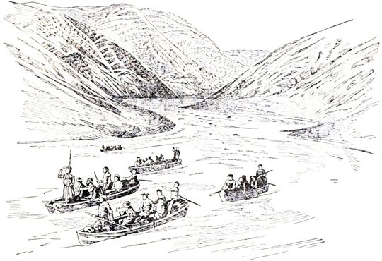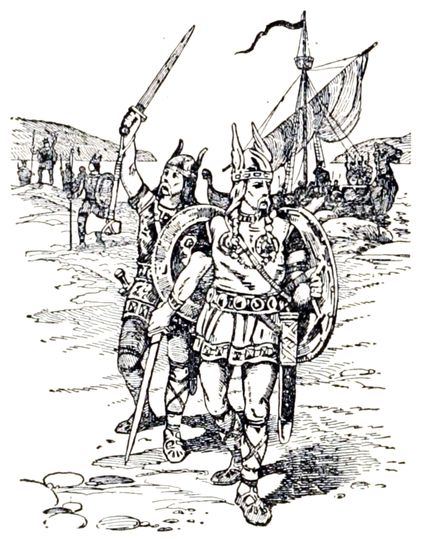 300. The Vikings or Sea-Rovers. The Northmen lived in the lands of Denmark, Norway, and Sweden. They lived on the inlets of the ocean, or viks, and were called "vikings." Their boats were long, and each one had a high prow with the head of a dragon or other fierce-looking animal upon it. They drove their vessels by sail or oar. Often there were as many as fifty rowers in a boat, their bright shields hanging over the sides. When the sun shone on them they looked like great moving lights. The Northmen were great sea-rovers and pirates.