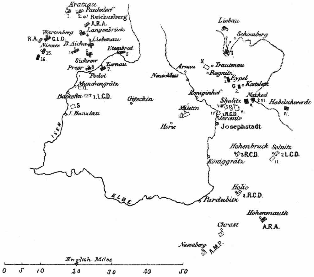 The Ist Corps, with one brigade of the IIIrd Corps and a cavalry division, on the left bank of the Iser, from[24] Turnau, through Müchengrätz to Jung Buntzlau, where the retreating Saxons formed on the left.
