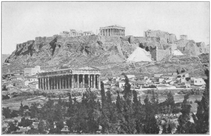 Around it and under the protection of its walls the people built their own huts and began to clear the land. They sowed various crops, planted the vine and the olive, and raised herds of sheep and goats. There was room enough [Pg xiii] within the walls for all the families, with their herds, to find shelter in the Acropolis in times of danger, from the attacks of the wild natives or of the still wilder beasts of the forests and fields.