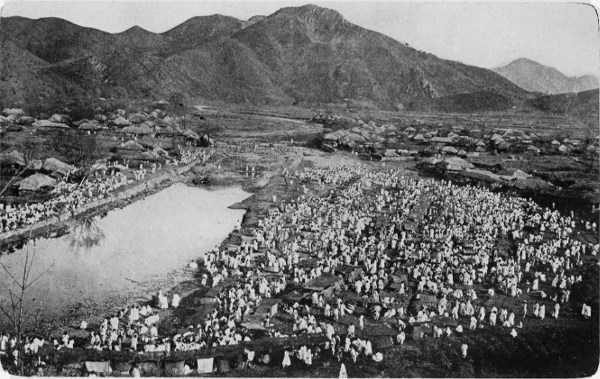 Entering through these gates, fortunately not yet 4 closed, we saw narrow, filthy streets, flanked by low mud houses, either thatched with straw, or tiled. It has been aptly said that the city looks like a vast bed of mushrooms, since none of the Korean houses are built more than one story high.