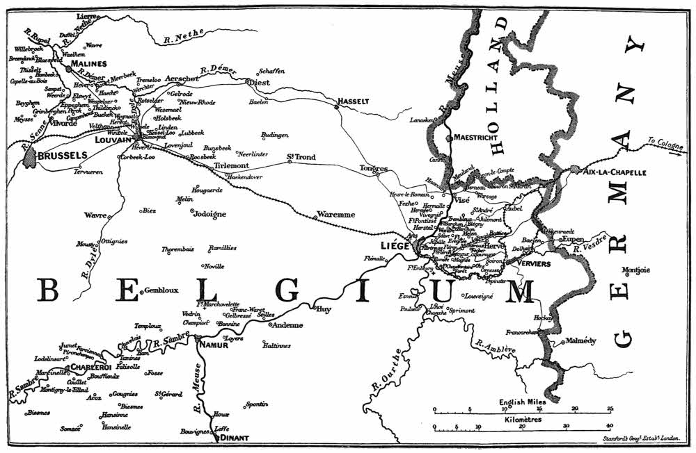 With the documents now published on both sides it is at last possible to present a clear narrative of what actually happened. The co-ordination of this mass of evidence, which has gradually accumulated since the first days of invasion, is the principal purpose for which the book has been written. The evidence consists of first-hand statements—some delivered on oath before a court, others taken down from the witnesses without oath by competent legal examiners, others written and published on the witnesses’ own initiative as books or pamphlets. Most of them originally appeared in print in a controversial setting, as proofs or disproofs of disputed fact, or as justifications or condemnations of fact that was admitted. In the present work, however, this argumentative aspect of them has been avoided as far as possible. For it has either been treated exhaustively in official publications—the[vi] case of Louvain, for instance, in the German White Book and the Belgian Reply to it—or will not be capable of such treatment till after the conclusion of the War. The ultimate inquiry and verdict, if it is to have finality, must proceed either from a mixed commission of representatives of all the States concerned, or from a neutral commission like that appointed by the Carnegie Foundation to inquire into the atrocities committed during the Balkan War. But the German Government has repeatedly refused proposals, made both unofficially and officially, that it should allow such an investigation to be conducted in the territory at present under German military occupation,[2] and the final critical assessment will therefore necessarily be postponed till the German Armies have retired again within their own frontiers.