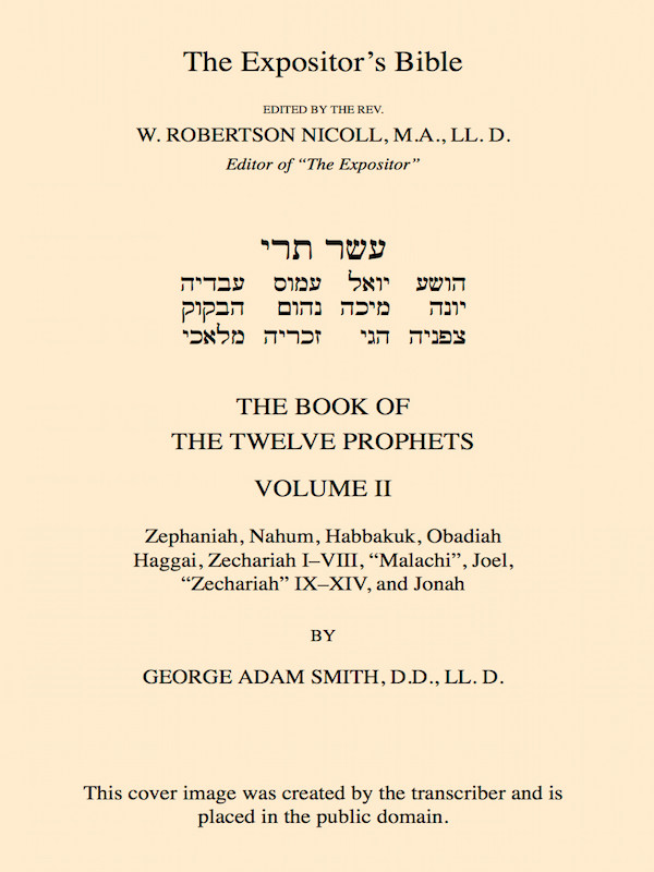 The first volume on the Twelve Prophets dealt with the three who belonged to the Eighth Century: Amos, Hosea and Micah. This second volume includes the other nine books arranged in chronological order: Zephaniah, Nahum and Habakkuk, of the Seventh Century; Obadiah, of the Exile; Haggai, Zechariah i.—viii., “Malachi” and Joel, of the Persian Period, 538—331; “Zechariah” ix.—xiv. and the Book of Jonah, of the Greek Period, which began in 332, the date of Alexander’s Syrian campaign.