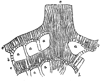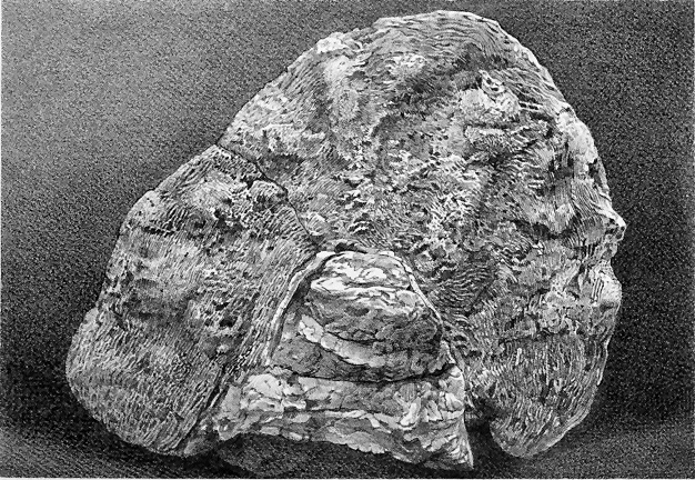 It is this composite sort of life which is connected with the main geological function of the Foraminifer. While active sensation, appetite, and enjoyment pervade the pseudopods and external sarcode of the mass, the hard skeleton common to the whole is growing within; and in this way the calcareous matter is gradually removed from the sea water, and built up in solid reefs, or in piles of loose foraminiferal shells. Thus it is the aggregative or common life, alike in Foraminifers as in Corals, that tends most powerfully to the accumulation of calcareous matter; and those creatures whose life is of this complex character are best suited to be world-builders, since the result of their growth is not merely a cemetery of their osseous remains, but a huge communistic edifice, to which multitudes of lives have contributed, and in which successive generations take up their abode on the remains of their ancestors. This process, so potent in « 215 » the progress of the earth’s geological history, began, as far as we know, with Eozoon.