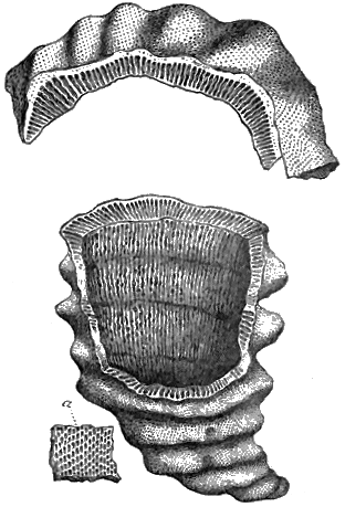 If we fail to learn anything of the origin of Eozoon, « 219 » and if its life-processes are just as inscrutable as those of higher creatures, we can at least inquire as to its history in geological time. In this respect we find in the first place that the Protozoa have not had a monopoly in their profession of accumulators of calcareous rock. Originated by Eozoon in the old Laurentian time, this process has been proceeding throughout the geological ages; and while Protozoa, equally simple with the great prototype of the race, have been and are continuing its function, and producing new limestones in every geological period, and so adding to the volume of the successive formations, new workers of higher grades have been introduced, capable of enjoying higher forms of animal activity, and equally of labouring at the great task of continent-building; of existing, too, in seas less rich in mineral substances than those of the Eozoic time, and for that very reason better suited to higher and more skilled artists. It is to be observed in connection with this, that as the work of the Foraminifers has thus been assumed by others, their size and importance have diminished, and the grander forms of more recent times have some of them been fain to build up their hard parts of cemented sand instead of limestone.