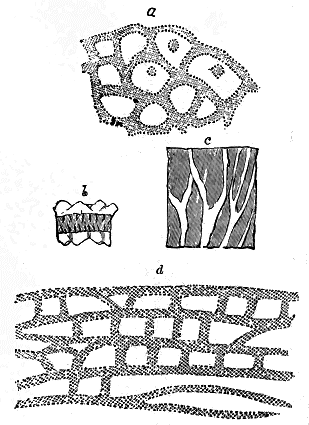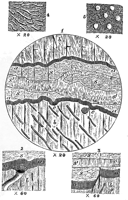 4. With respect to the proper wall and its minute tubulation, the essential error of the authors consists in confounding it with fibrous and acicular crystals, and in maintaining that because the tubuli are sometimes apparently confused and confluent they must be inorganic. With regard to the first of these positions, I may repeat what I have stated in former papers—that the true cell-wall presents minute cylindrical processes traversing carbonate of lime, and usually nearly parallel to each other, and often slightly bulbose at the extremity. Fibrous serpentine, on the other hand, appears as angular crystals, closely packed together, while the numerous spicular crystals of silicious minerals which often appear in metamorphic limestones, and may be developed by decalcification, appear as sharp angular needles usually radiating from centres or irregularly disposed. Their own plate (Ophite from Skye, King and Rowney’s Paper, Proc. R. I. A., vol. x.), is an eminent example of this; and whatever the nature of the crystals represented, they have no appearance of being true tubuli of Eozoon. I have very often shown microscopists and geologists the cell-wall along with veins of chrysotile and coatings of acicular crystals occurring in the same or similar limestones, and they have never failed at once to recognise the difference, especially under high powers.