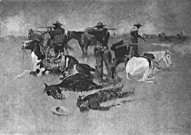 Remington brought all his subjects fresh from life straight to his canvas. He lived an active outdoor life, worked hard, and was ever seeking for new material. It was his dream to go to a real war, and in 1898 he got his chance. The well known playwright, Augustus Thomas, for years a neighbor of Remington’s, states that he called the artist up early one morning in February, 1898, and told him that the Maine had been blown up and sunk. The only thanks or comment he got was a shout from Remington, “Ring off!” As Thomas rang off he could hear Remington call the private telephone number of his publishers in New York. At that very minute the artist was in his mind already entered for war service.