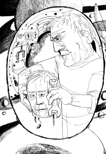 All Manet had to do was sit in the beating aluminum heart in the middle of the chalk desert and stare out, chin cupped in hands, at the flat, flat pavement of dirty talcum, at the stars gleaming as hard in the black sky as a starlet's capped teeth ... stars two of which were moons and one of which was Earth. He had to do nothing else. The whole gimcrack was cybernetically controlled, entirely automatic. No one was needed here—no human being, at least.