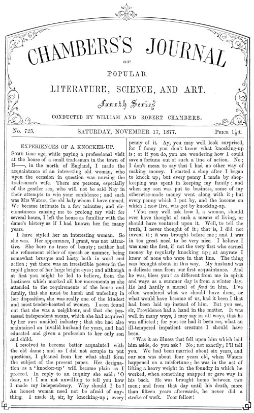 Note.—Since the writer of the above article had his conversations with Mrs Waters, he had a long talk with a civil but illiterate man whom he fell in with during a journey by rail. It came out that he got his living chiefly by knocking-up, having over eighty regular customers, from whom he obtained on an average twenty-eight shillings a week. This was in a town six miles from the scene of Mrs Waters' toils. But like most other money-making avocations, this one has become over-run with competitors, as is evident from the fact that the writer meets in his short early morning walk into the town at least half a dozen knockers-up of both sexes; so that few are now, he believes, so fortunate as either the man above named, or Mrs Waters.