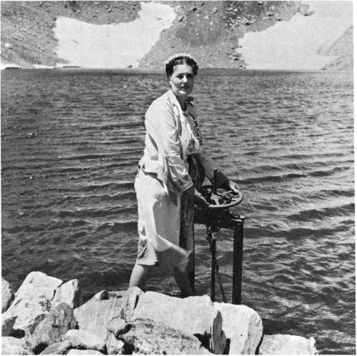 She is shown standing beside the headgate at Lake Caroline on Mt. Bancroft, a Continental Divide peak named for her grandfather. The photo was taken by Charles Eaton in the summer of 1956.