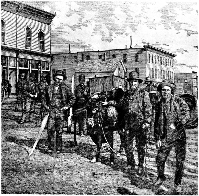 In those days the Tabor residence stood on Harrison Avenue; and can be seen toward the rear of this sketch, occupying the space between the Clarendon Hotel and some new stores. Augusta’s boarders would have looked exactly like these men. Although most of her boarders in 1878 were Tabor’s clerks, they spent every hour of their free time searching the hills for silver like everyone else. This was a typical prospecting outfit.