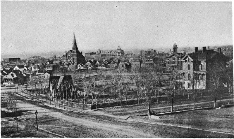 The Tabor Grand rose like a cathedral beyond the spired church. At far right is Augusta’s house. The light building behind the present Navarre Restaurant is the Windsor Hotel. The tall business building in the middle was the Tabor block. The Brown was a triangular cow pasture. In front of it was Augusta’s coach house that faced Seventeenth Avenue.