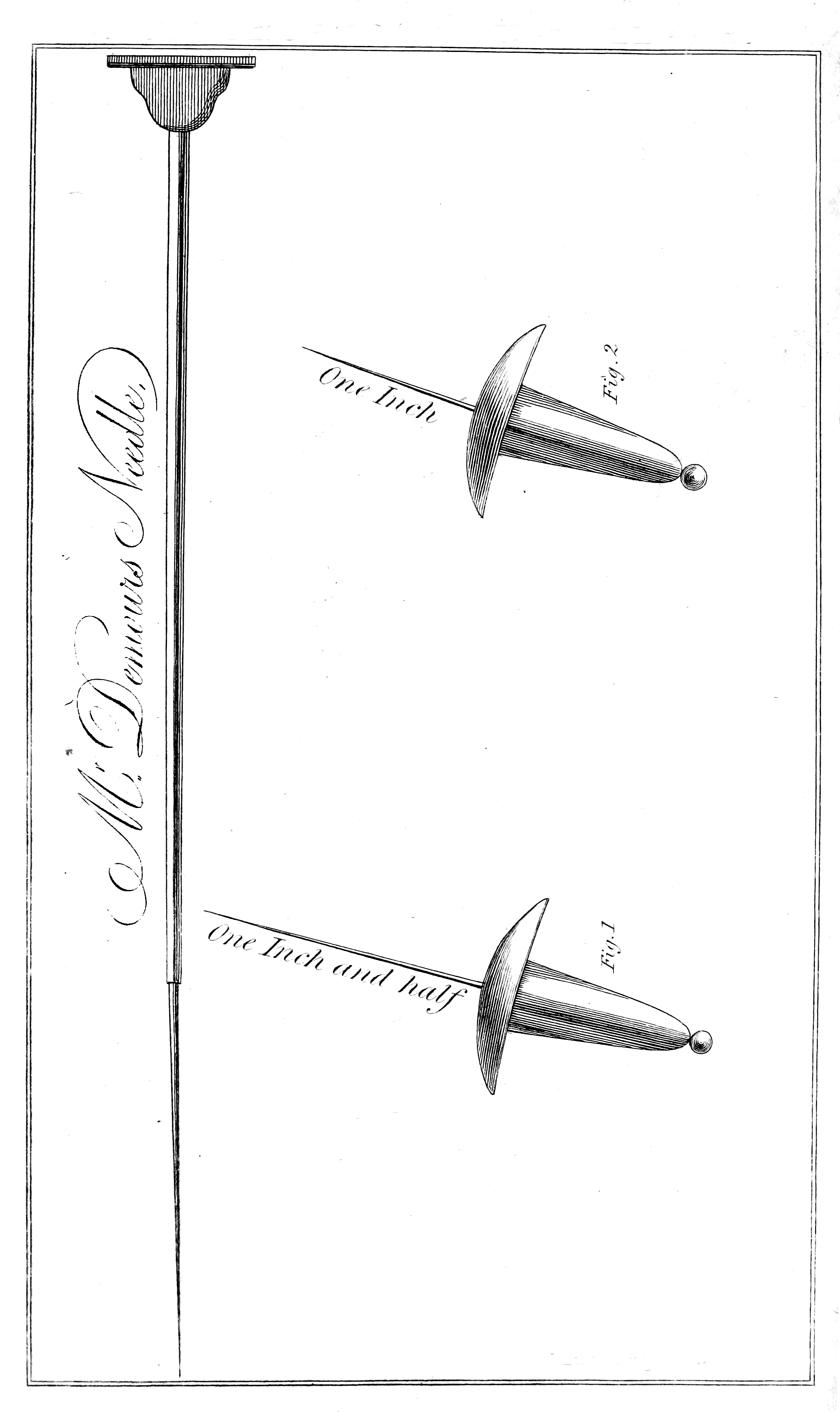 “These needles are of two sorts with respect to their structure, as well as materials; the one, either of gold or silver indifferently, and about four inches long, very slender, and ending in a sharp point, and have at the other end a small twisted handle, which serves to turn them round with the extremity of the middle finger and thumb, in order to sink them into the flesh with greater ease and safety;18 the other is chiefly of silver, and much like the first in length and shape, but exceedingly small towards the point, with a short thick handle, channelled for the same end of turning them about, and to prevent their going in too deep; and for the same reason, some of them are cased in a kind of copper tube, of the bigness of a goose quill, which serves as a sort of guage, and lets the point in, just so far as the operator hath determined it. The best sort of needles are carefully kept in a case made of bull’s horn, lined with some soft downy stuff. This case is shaped somewhat like a hammer, having on the striking side a piece of lead, to give it a sufficient weight, and on the outside a compressed round piece of lea19ther to prevent a recoil, and with this they strike the needle through the thickness of the skin; after which they keep turning the handle about with the hand, till it is sunk to the depth they design it, that is, till it is thought to have reached the seat of the morbific virus, which in grown persons is seldom less than half, or more than a whole inch: this done, he draws it out, and compresses the part, in order to force the morbific vapour or spirit out.