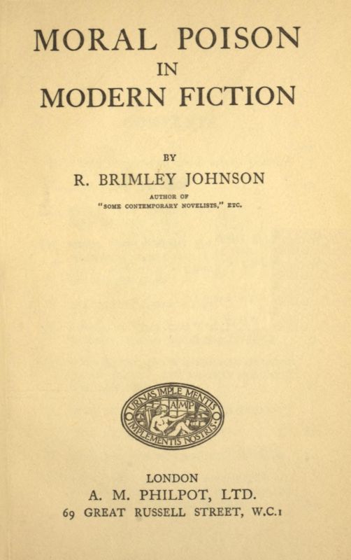 The Project Gutenberg EBook of Moral Poison in Modern Fiction, by Reginald Brimley Johnson This eBook is for the use of anyone anywhere in the United States and most other parts of the world at no cost and with almost no restrictions whatsoever. You may copy it, give it away or re-use it under the terms of the Project Gutenberg License included with this eBook or online at www.gutenberg.org. If you are not located in the United States, you'll have to check the laws of the country where you are located before using this ebook. Title: Moral Poison in Modern Fiction Author: Reginald Brimley Johnson Release Date: January 23, 2016 [EBook #51015] Language: English Character set encoding: UTF-8 *** START OF THIS PROJECT GUTENBERG EBOOK MORAL POISON IN MODERN FICTION *** Produced by Clarity, Lisa Reigel, Michael Zeug, and the Online Distributed Proofreading Team at http://www.pgdp.net (This file was produced from images generously made available by The Internet Archive/Canadian Libraries)