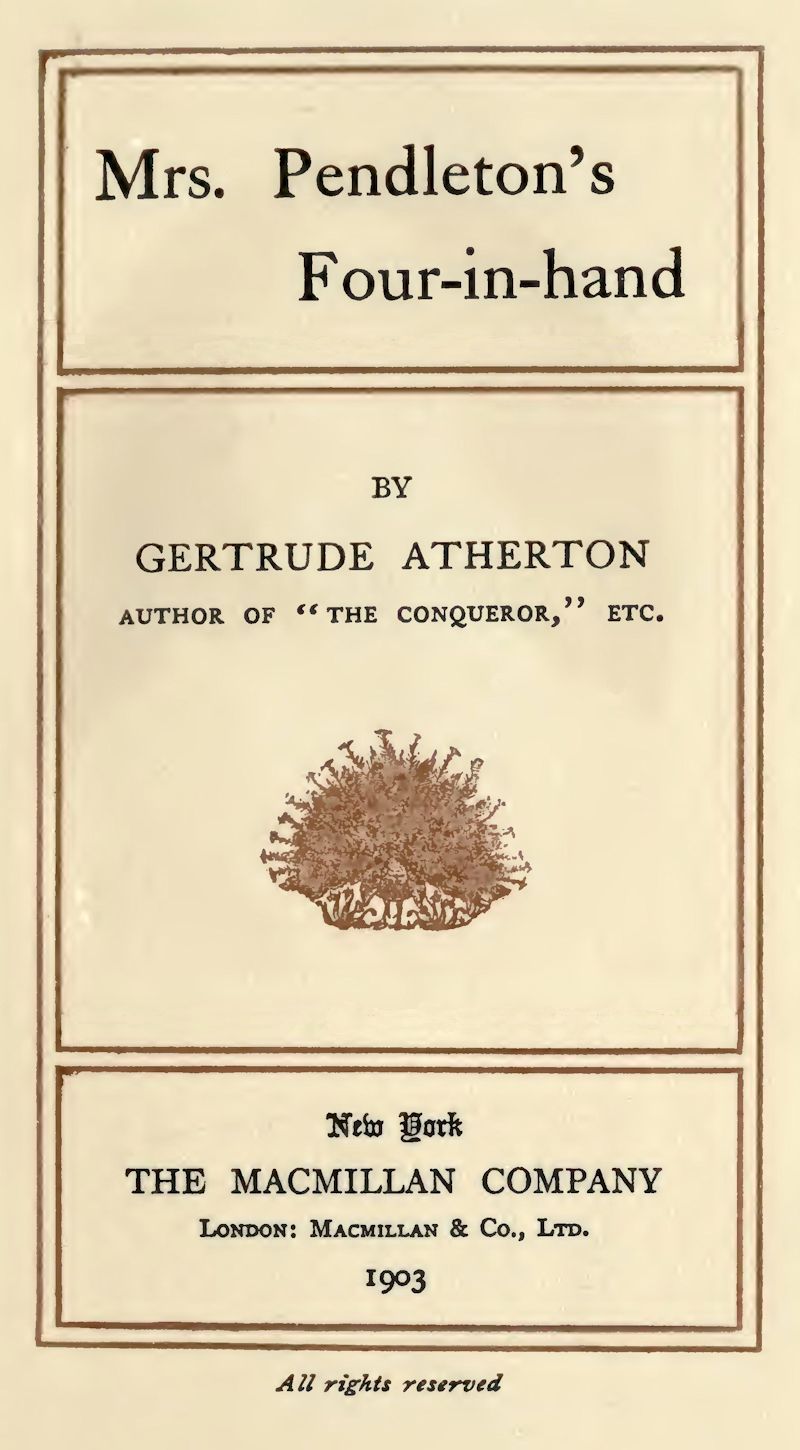 Project Gutenberg's Mrs. Pendleton's Four-in-hand, by Gertrude Atherton This eBook is for the use of anyone anywhere in the United States and most other parts of the world at no cost and with almost no restrictions whatsoever. You may copy it, give it away or re-use it under the terms of the Project Gutenberg License included with this eBook or online at www.gutenberg.org. If you are not located in the United States, you'll have to check the laws of the country where you are located before using this ebook. Title: Mrs. Pendleton's Four-in-hand Author: Gertrude Atherton Release Date: January 27, 2016 [EBook #51059] Language: English Character set encoding: UTF-8 *** START OF THIS PROJECT GUTENBERG EBOOK MRS. PENDLETON'S FOUR-IN-HAND *** Produced by Mardi Desjardins & the online Distributed Proofreaders Canada team (http://www.pgdpcanada.net) from page images generously made available by the Internet Archive American Libraries (https://archive.org/details/mrspendletonsfou00atherich).