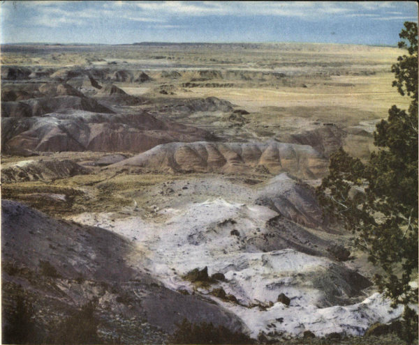 There is much more to the fascinating story of the Petrified Forest as told to us by naturalists of the national monument. Few visitors take time from their mad rush to “get somewhere quickly” to make the effort to understand the intricate and devious ways of Nature, of which “Time is the essence,” resulting in the spectacular and brilliant display, this glittering jewel of the desert, the Petrified Forest. Stopping only long enough to marvel briefly, many of them feel the urge to take something with them, some concrete reminder of the colorful scene, some bits of petrified wood. Those who successfully “get past” the checking station ranger with their illicit souvenirs usually lose these trinkets, or find them turned to sharp goads which prod their consciences in later years. How fortunate those visitors who, at the expense of an hour or so of time, gain an understanding of what lies behind the scenery at the Petrified Forest, thereby developing an appreciation of the work of Nature and of God as exemplified here. These people take with them, not merely a souvenir, but an experience which they will treasure and enjoy throughout the remainder of their lives.