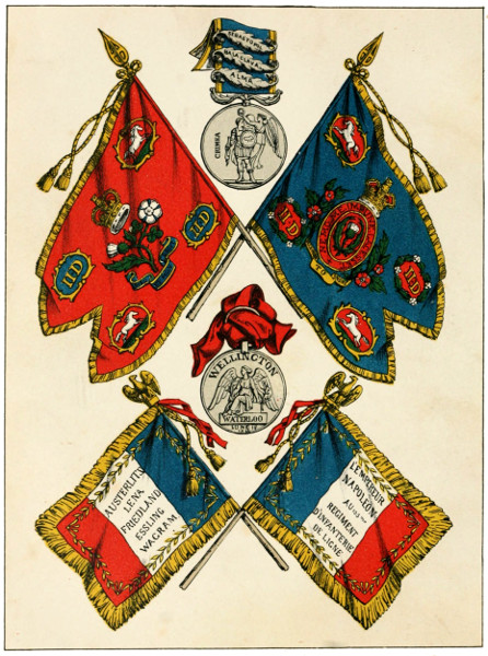 To stem the torrent of rebellion which the return of Dundee to Scotland had excited—especially among the Highland clans, nearly all of whom were devotedly attached to the Stuarts—the Royal Scots Dragoons were ordered to return to Scotland. Throughout the succeeding campaigns the regiment behaved with signal fidelity and gallantry, with the exception of some few of its officers who were found guilty of treasonable intercourse with the rebels—having a sympathy with their old comrade in arms, Viscount Dundee. Amongst the arrested were Lieut.-Colonel Livingstone, Captains Murray, Crichton, and Livingstone. The royal forces under the command of Major-General Mackay, included, besides the Royal Scots Dragoons, many regiments since known to fame—Lord Colchester’s Horse, or the Third (Prince of Wales’) Dragoon Guards; Berkeley’s, or the Fourth (Queen’s Own Hussars) Dragoons; Sir James Leslie’s, or the Fifteenth (York, East Riding) Foot; besides a considerable body of Dutch troops under Colonel Ramsay. Dundee was joined at Inverness by Macdonald of Keppoch and his clan, thirsting for revenge because of the 21atrocities committed upon them and theirs by the soldiers in the previous year. After much time spent in marching and counter-marching in search of, and pursuit of, each other, the two armies met at the Pass of Killiecrankie, when the death of Dundee, in the moment of victory, virtually ruined the Jacobite cause. The Royal Scots Dragoons, although not present at that disastrous battle, had previously distinguished themselves in a skirmish with a body of about 500 Highlanders, chiefly Macleans, who, defeating with great loss, they dispersed, and, dismounting, pursued among the rocks and crags of the mountains. In the following year, the rebels still continuing in arms, under General Canon—who on the death of Dundee assumed the command—and being recruited by a body of men from Ireland under General Buchan, took up a strong post and awaited the attack of the royal forces at Cromdale. Here, on the morning of the 31st April, they were suddenly attacked by Sir Thomas Livingstone, at the head of the Royal Scots Dragoons and other troops, and, amid the darkness and confusion, totally defeated and dispersed with great slaughter. The scene was one of consternation and horror, and had it not been for the merciful intervention of a mountain mist, as if to befriend her own children in their day of calamity, would have proved even more fatal to the flying enemy. In this action the Royal Scots Dragoons took a gallant part. This victory was quickly followed by the relief of the castle of Abergeldie, then besieged by the Highlanders, where two troops of the Royal Scots Dragoons utterly routed the rebels with great carnage. Unable longer to sustain such 22a hopeless struggle, the clans tendered their submission to King William, which was accepted.