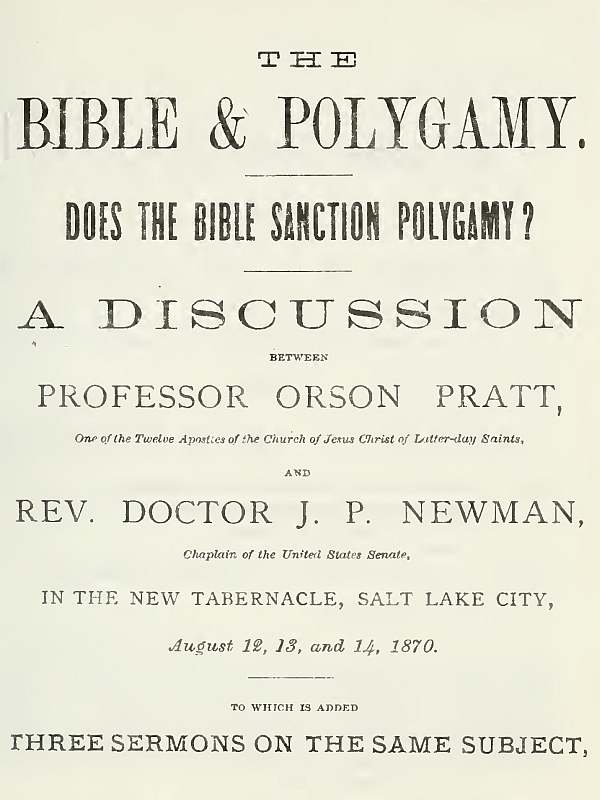 1. The article in the "Telegraph," of May 3rd, contains these expressions, alluding to my sermon as reported in the N. Y. "Herald," it says: "The discourse was a lengthened argument to prove that the Bible does not sustain polygamy. * * * * * * * * The sermon should have been delivered in the New Tabernacle in this city, with ten thousand Mormons to listen to it, and then Elder Orson Pratt, or some prominent Mormon, should have had a hearing on the other side and the people been allowed to decide. * * * * * Dr. Newman, by his very sermon, recognizes the religious element of the question. * * * * Let us have a fair contest of peaceful argument and let the best side win. * * * We will publish their notices in the "Telegraph," report their discourses as far as possible, use every influence in our power, if any is needed, to secure them the biggest halls and crowded congregations, and we are satisfied that every opportunity will be given them to conduct a campaign. We base this last remark on a statement made last Sunday week in the Tabernacle by President Geo. A. Smith, that the public halls throughout the Territory have been and would be open to clergymen of other denominations coming to Utah to preach. * * * Come on and convert them by the peaceful influences of the Bible instead of using the means now proposed. Convince them by reason and Scriptural argument and no Cullom Bill will be required."