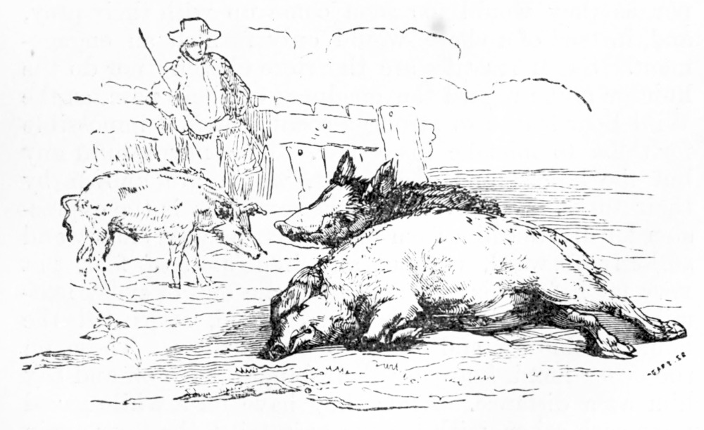 V. Pecora.—Having no front teeth in the upper jaw; six or eight in the lower jaw, situated at a considerable distance from the grinders; and the feet with hoofs, as cattle and sheep.