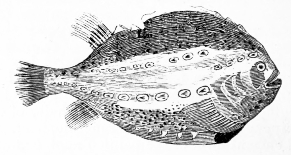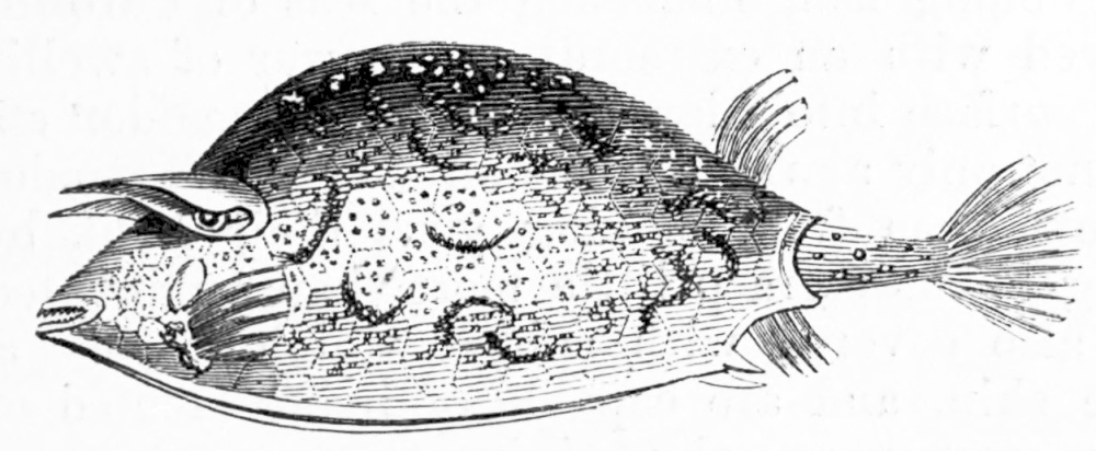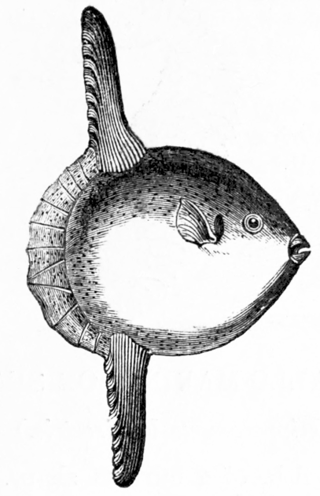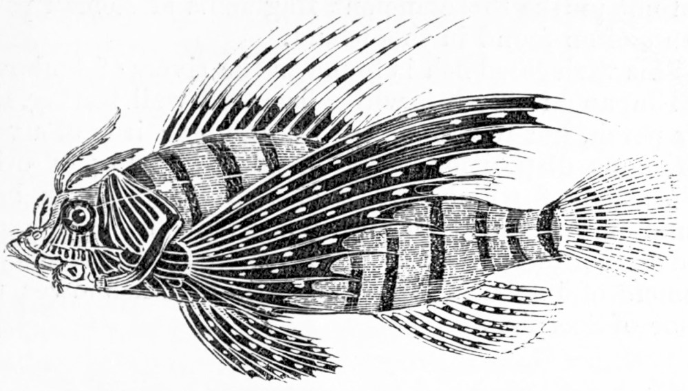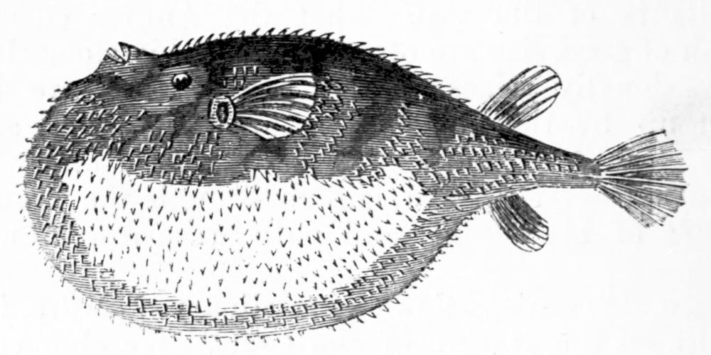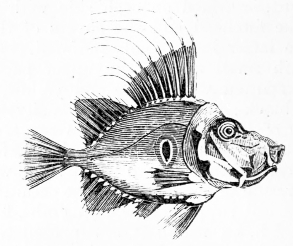 Fishes constituted Linnæus’s fourth class of animals. They are all inhabitants of the water, in which they move by certain organs called fins. Those situated on the back are called dorsal fins; those on the sides, behind the gills, pectoral fins; those below the body, near the head, are ventral; those behind the vent are anal; and that which forms the tail is called the caudal fin. Fishes breathe by gills, which, in most species, are situated at the sides of the head. Fishes rise and sink in the water, generally by a kind of bladder in the interior of the body, called an air-bladder. Some of them do not possess this organ, and consequently are seldom found but at the bottom of the sea, from which they can only rise by an effort. The bodies of these animals are usually covered with scales, which keep them from injury by the contact of the water.