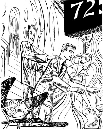 Jeff and Ann blinked in mystification. Then they remembered his instruction to watch the other screen. They turned. After a moment, in the far distance down the long moving corridor, they could see a stocky figure. The motion of the picture brought him nearer. In a few seconds, he was recognizable as Snader—and as the picture brought him forward, he stepped down out of it and was with them again.