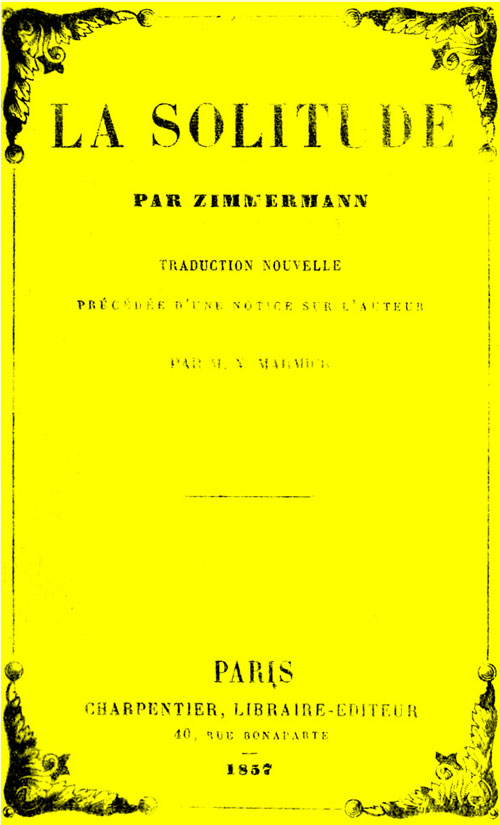 Les Anglais ont fait des quatre volumes diffus de Zimmermann un joli volume qui figure honorablement dans la collection des British Classics de Walker. Mercier, qui le premier fit connaître cet ouvrage en France, M. Jourdan, à qui nous en devons une traduction qui annonce une parfaite connaissance de la langue allemande, et quelques autres traducteurs ont considérablement abrégé cet ouvrage, et nous croyons qu'il doit être plus abrégé encore.