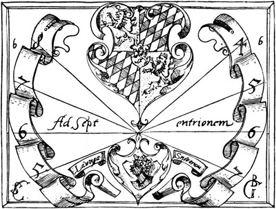 1. Sonnenuhr in Becherform mit spärlichem Pflanzenornament und figürlichem Schmuck; zur Seite links in barocker Umrahmung ein herzförmiges Schild mit dem Kopf eines Einhorns über einer heraldischen Rose, möglicherweie das Wappen des Nürnberger Mathematikers Caspar Uttenhofer († 1621)[5], dem unser Kupferstich gewidmet ist (»Domino Caspare Uttenhofero Norimbergensi amico suo singulari dedicat Author«), und von dessen nahen freundschaftlichen Beziehungen zu dem Lauinger Künstler uns auch sonst Zeugnisse erhalten sind[6]. Längs der Peripherie des kleineren inneren[S. 7] Kreissegments liest man: »Georgius Brentel Lavinganus pictor faciebat«. Ganz rechts an der Peripherie des großen äußeren Kreissegments die Jahreszahl MDCVIII. Plattengröße: 220: 130 mm (vgl. Fig. 2).